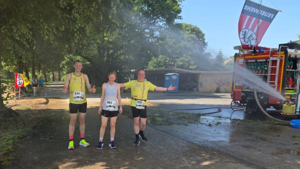 Sie wurden belohnt mit einer tollen Stimmung entlang der Laufstrecke. Im Bereich vor und hinter der Kettenbrücke war es unter den Bäumen bei einem leichten Luftzug sogar noch verhältnismäßig kühl. Kurz vor dem Verpflegungspunkt sorgte die Feuerwehr ebenfalls für eine willkommene Abkühlung, indem ein Wasserbogen gesprüht wurde.