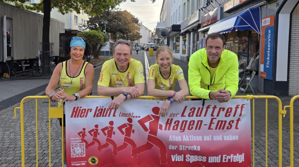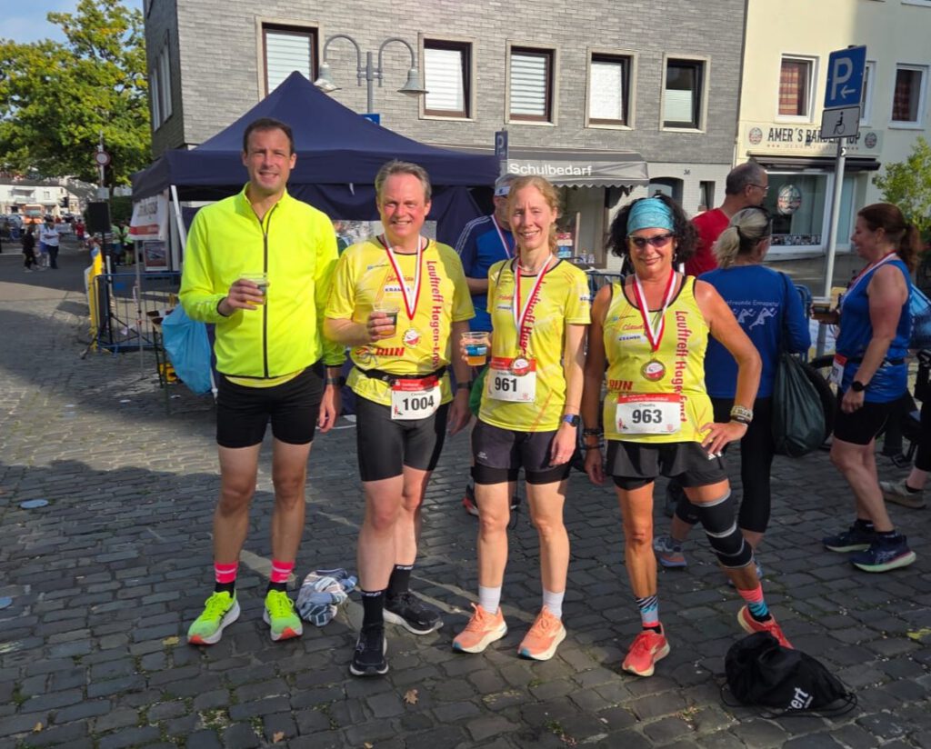Die am frühen Morgen zwar noch spärlich verteilten Besucher, sowie die Streckenposten haben uns unermüdlich angefeuert und beflügelt. Vom Lauftreff Hagen-Emst haben Friederike, Claudia R., Stefan und Christian die morgendliche Herausforderung angenommen. Alle Lauftreffler konnten sich über eine Platzierung in ihren Altersklassen freuen: Friederike 1. AK W50 (0:49:58 h), Claudia R. 1. AK W55 (1:01:16 h), Stefan 2. AK M40 (0:43:15 h), Christian 2. AK M55 (0:55:37 h).